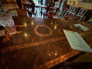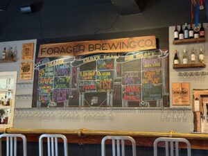 Forager has a fascinating interior and will soon be sharing space with Parlor Doughnuts (opening soon, and you walk through the doughnut shop to get to the brewpub). Here are several photos of the interior, including a partial view of the penny-covered tabletop that spells out “Forager.”