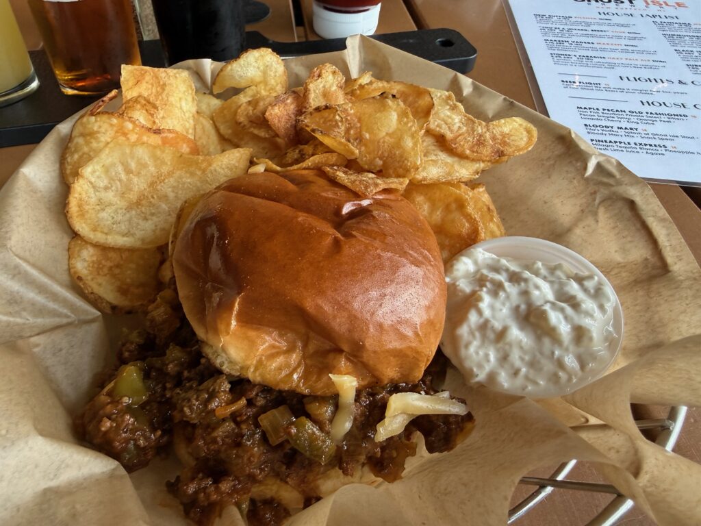 This is the Sloppy Joe, a massive pile of ground beef and onions/peppers/Gouda with a bit of spicy heat to it (encouraging you to keep drinking beer!). It comes with house chips or fries and the waitress recommended the house chips and I agree with her — the chips by themselves are really good, but with that dip? Superb!