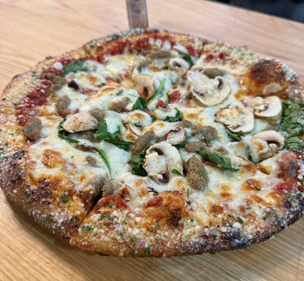 I had been so sure that I’d had something other than a pizza the last time I was here, but when I checked my previous post just now, I saw that I’d ordered exactly the same thing, a 10″ pie with sausage, mushrooms, and spinach! How boringly consistent, but this is a really tasty meal (and I do need to remember to order the 7″ pie the next time as the 10″ is a LOT of food for me).